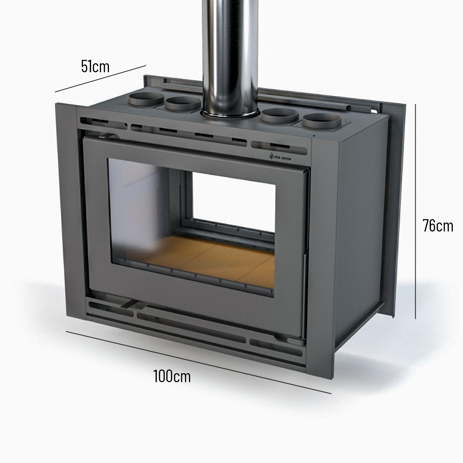 La estufa insertable Praga Doble Frente de Eko Varmo combina la eficiencia con el estilo rústico de las tejuelas refractarias en un formato que permite una vista panorámica del fuego, ideal para colocar al centro de tu casa, esta estufa crea un ambiente inigualable y acogedor.