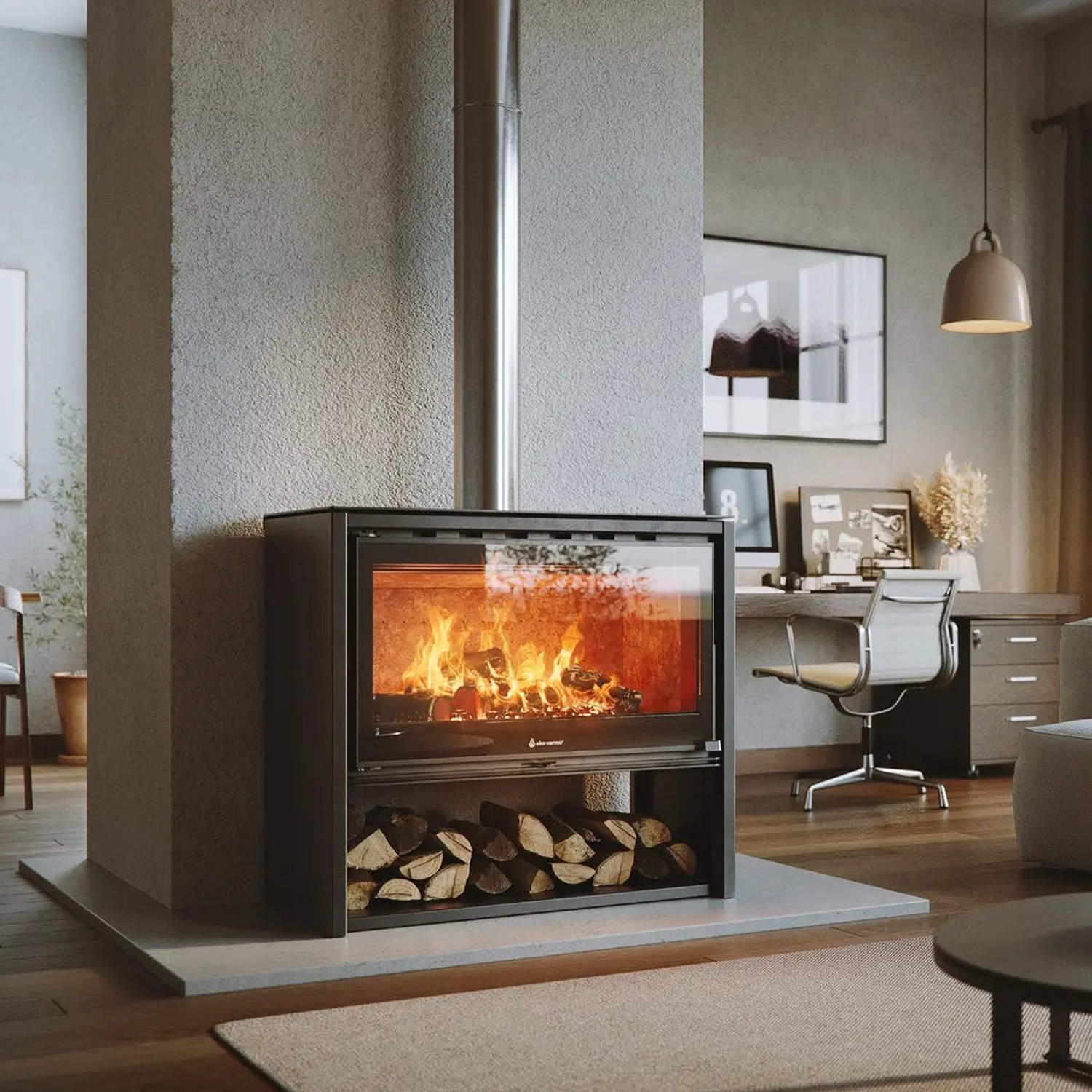 La línea Vantage M de Eko Varmo está diseñada para ofrecer máxima eficiencia y un estilo contemporáneo. Equipado con la tecnología de doble deflector, este modelo asegura que el aire circule más tiempo dentro de la estufa antes de ser expulsado, permitiendo un menor consumo de leña. El revestimiento interior de vermiculita de República Checa y el vidrio serigrafiado Scotts Robax fabricado en Alemania mejoran su rendimiento y estética. El diseño minimalista de la Vantage M la convierte en una opción ideal para cualquier hogar moderno.